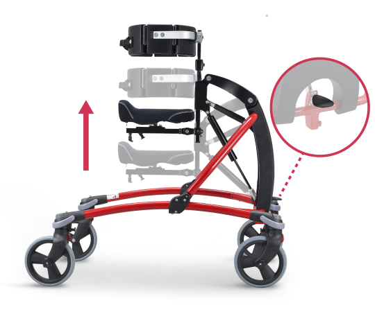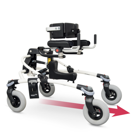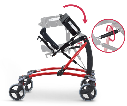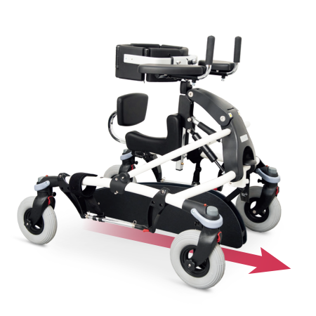 配備簡易操作的旋轉機構,可靈活調整座椅角度,以適應使用者不同的能力需求,並在直立或前傾姿勢間自由切換。前傾角度藉由力學原理引導孩童自然前行,提升其步行動力。多方位支撐配件穩定座椅,使訓練個案在探索、自立和參與中獲得積極回饋,有助於促進感知發展並強化自主行動。