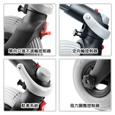 姿勢不對稱的兒童在直線行走時,可透過單向只進不退輪控制器與定向輪控制器,確保行走方向穩定,避免側向偏移或向後滑動。此外,阻力調整控制器可根據兒童的需求設置合適的阻力,隨著步態訓練的進展,所有輪子也可逐步解鎖,進一步增強操作控制力。陪同的介護者只需輕踩輪子上的駐車系統,便能輕鬆將車體固定,提高訓練過程中的安全性與便利性。